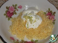 Приготовить соус. Для этого на мелкой терке натереть сыр, смешать с раздавленным чесноком и сметаной. |