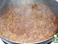 Пока фарш тушится, добавить к нему специи и 150 мл воды. Продолжать тушить, пока вся вода не испариться. По специям ориентируйтесь на свой вкус. Если любите по-острее, то можно добавить больше перца. |