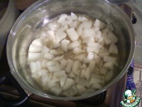 В сковороду с раскаленным растительным маслом бросаем лук, нарезанный кубиками. Мне нравится, чтобы в еде лук чувствовался, поэтому я режу его крупно. Обжариваем. |
