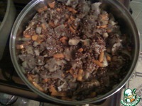 Когда лук стал прозрачным, добавляем морковку и грибы. Все перемешиваем и обжариваем минут 15-20. Солим, перчим по вкусу, добавляем зелень. |