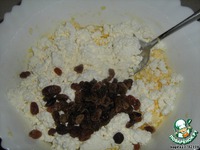 Всыпаем пропущенный через мясорубку творог и изюм. |