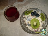 Все фрукты нарезаем кубиками...у меня был еще виноград (черный, с небольшими косточками - ничего страшного).... |
