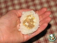 Затем закрывают начинку рисом и, плотно обминая руками, формируют колобки. |