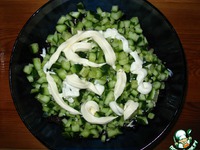 3 слой: огурец мелко нарезать, (можно на терке), немного посолить и смазать майонезом. |