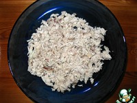 1 слой: мелко нарезаем куриную грудку, укладываем на дно миски и смазываем майонезом. |