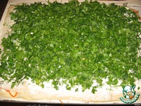 На третий лаваш укладываем зелень, не забудьте смазать майонезом. |