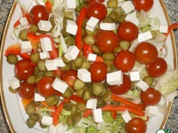 Положить в салатник, добавить целые помидоры черри, салат порвать руками.