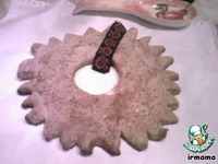 Раскатываем тесто, делаем круг, посередине вырезаем дырку, а края обрезаем треугольниками. Получилось солнышко. |
