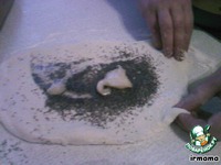 Тесто раскатали, положили сверху часть мака, ложку подсолнечного масла, ложку меда |