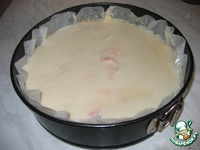 Разъемную форму застелить пергаментной бумагой, смазать сливочным маслом и распределить тесто по форме. |
