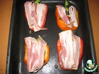 Начиняем наши перчики, поливаем оставшимся в миске соком, сверху кладем бекон. Выкладываем подготовленные перчики на слегка смазанный оливковым маслом противень. |