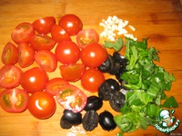 Готовим начинку для перчиков: нарезаем листья базилика, рубим чеснок, а черри и оливки режем пополам. Чили нарезаем тоненькими полосками (предварительно убрав семена). |