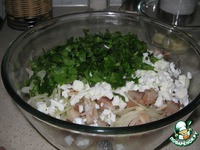 Зелень мелко рубим и добавляем к остальным продуктам в салатник. |