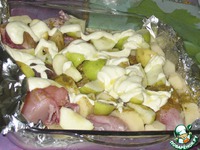 Последним слоем кусочки яблок. Заливаем сметаной. Для снижения калорийности сметану можно заменить 200-300 мл молока. Сверху немного майонеза. |