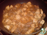 Сварить вермишель. Куриные грудки порезать небольшими кусочками и обжарить их на сливочном масле с сердечками. Добавить соевый соус и тушить 15 минут. |