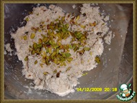 Фисташки слегка обжарьте на сухой сковородке и добавьте к куриной массе. |