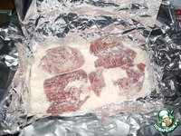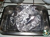 Укладываем фольгу на противень, из фольги делаем "тарелку" (фольгу в 4 раза сворачиваем, чтобы плотная была). |