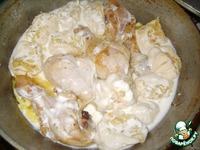 В кружке к сметане добавить немного воды, размешать и получившейся смесью залить содержимое сковороды. Накрыть крышкой и тушить до готовности. |