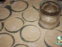 Тесто раскатать на присыпанной мукой поверхности примерно толщиной в 0,5 см. С помощью стакана вырезать кружки. |