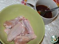 Крылья я лично делю на 2 части по хрящу, а "хвостик" выбрасываю... смешиваем ингредиенты для соуса (2,3,4,5 по списку), вымешиваем (я в микроволновку ставила на пол минутки чтобы скорее растворить мед)... Заливаем смесью курочку минимум минут на 10...