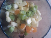 Описание: Простенький, но очень вкусный десерт. Муж практически не ест фрукты, но в таком виде они уходят на ура и у большого, и у маленького мужчин. В этот раз у меня были киви, бананы, мандарины и яблоко, но подходят, по-моему, любые плодово-ягодные.