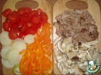 Берём начику любую, на ваше усмотрение (у меня была: варёная индейка, лук, грибы, помидоры, перец болг., марин.огурчики). |