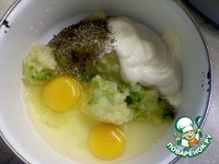 Лук пропустить через мясорубку, добавить майонез, яйца и хорошенько всё перемешать (можно воспользоваться для этого блендером). |