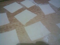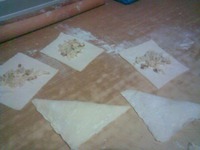 Тесто разморозить, раскатать и разрезать на квадраты. |