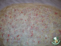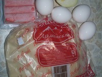 Сварить яйца и измельчить. Накрыть первый пропитанный лист лаваша вторым листом. Опять смазать маонезом с чесноком, выложить слой измельченных яиц и слой крабовых палочек. |