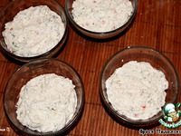 Кладем их на дно пиалок, окружаем икрой и/или мелко нарезанным огурцом. |