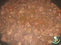 Добавляем сначала резаные желудочки - обжариваем, потом сердечки - обжариваем и последней - печенку. |