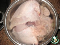 Курицу отварить до готовности в подсоленной воде, снимая шум в процессе варки. Остудить и курицу и бульон, который будет нами использоваться для соуса. |