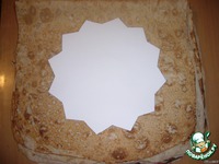 Лаваш уложить в ровную стопочку, из бумаги вырезать снежинку. |