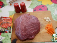 Вот наши ингредиенты. Телятину помыть. Hарезать тоненькими полосочками морковь и чеснок. |