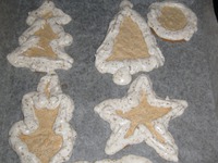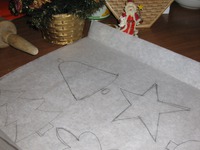 Разогреть духовку до 150 гр. На обратной стороне бумаги для выпечки нарисовать новогодние мотивы. |