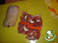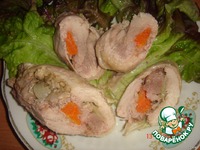 Морковь нарезать длинными брусочками, чеснок пластинами. Выложить на филе, свернуть рулетом. |