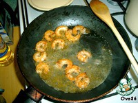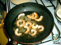 В это время обжарить на оливковом масле очищенные креветки 2-3 минуты. Креветки можно предварительно отварить или использовать сырые. |