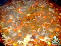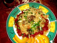 Плов готов. Разложить по тарелкам и полить кетчупом. Украсить овощами. Рюмка коньяка здесь не помешает. |
