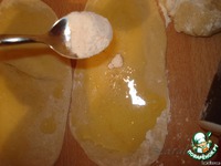"Спинкой", то есть не надрезанной стороной кладём в форму (смазанной маслом) на небольшом расстоянии друг от друга. Разрезы смотрят вверх! |