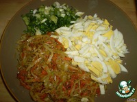 Нарезать капусту, обмять и обжарить с натертой морковкой, посолить и поперчить. Нарезать отваренные яйца и зеленый лук, все перемешать. |