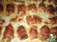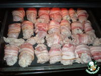 Сворачиваем и заворачиваем в бекон. выкладываем на противень. выпекаем 30-40 мин при 200 гр. |