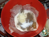 Замариновать майонезом, горчицей, туда же чеснок, соль, перец по вкусу. |