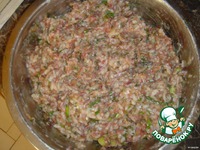 Смешать фарш, рис отварить до полуготовности, половину моркови натереть на тёрке, весь лук, зелень, соль, перец. |
