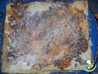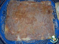 8 шаг - Каждый корж слегка смазываем майонезом. Равномерно распределяем паштет и лук с морковкой. Это первый корж. |