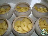 В подготовленные горшочки укладываем картофель, порезанный крупными кубиками. |