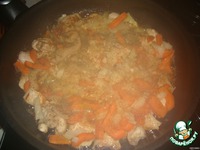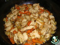 Отправляем обжариваться грудку на сковородку. После того как грудка обжарилась, добавляем к ней лук и морковь. |