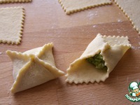 В центр каждого квадратика выложить начинку из брокколи. Соединить все 4 угла квадрата как на манты. |