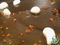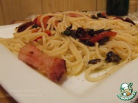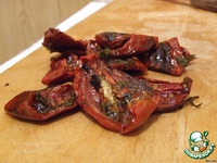 -в сковороду, где у нас чесночно-перечное масло, добавляем подчеревок, рубленые томаты, маслины и перец. Прогреваем минут 5, после чего прибавляем зелень. Готовим несколько минут. |