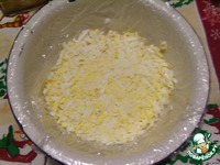 Форму выстелить пищевой пленкой. Сыр натереть на крупной терке и выложить в форму. |