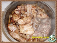 Перелить содержимое сковороды в посуду, где уже лежит курица. |